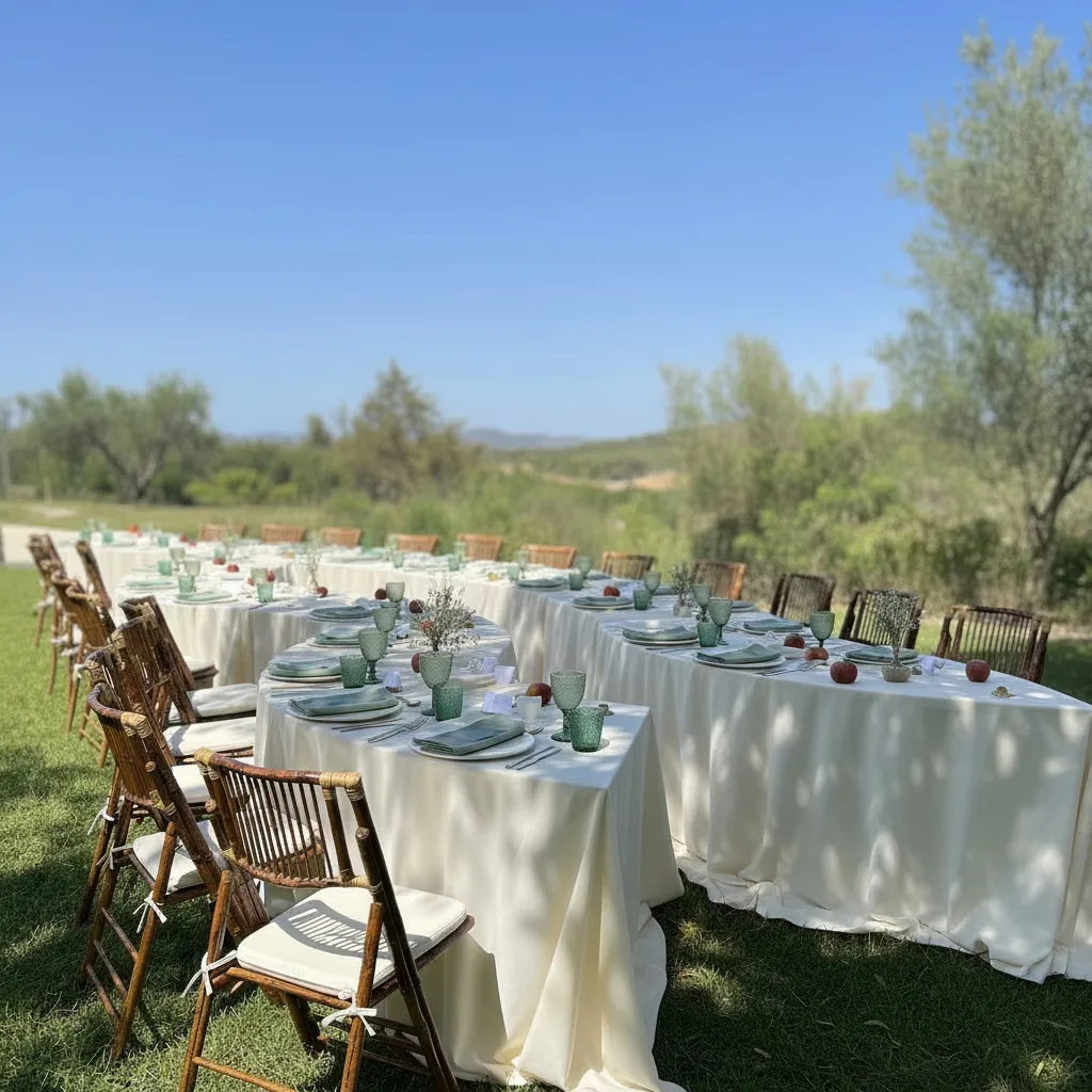 Bodas con sello mediterráneo: mesa larga bajo olivos, cortador de jamón, lunas encendidas al caer la tarde.